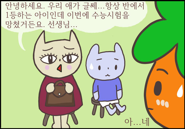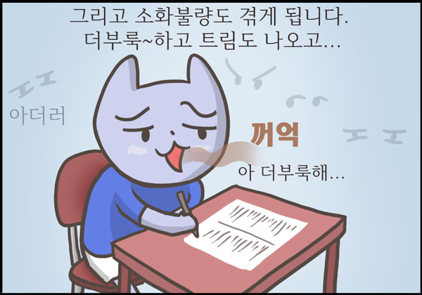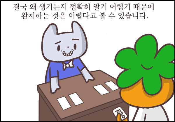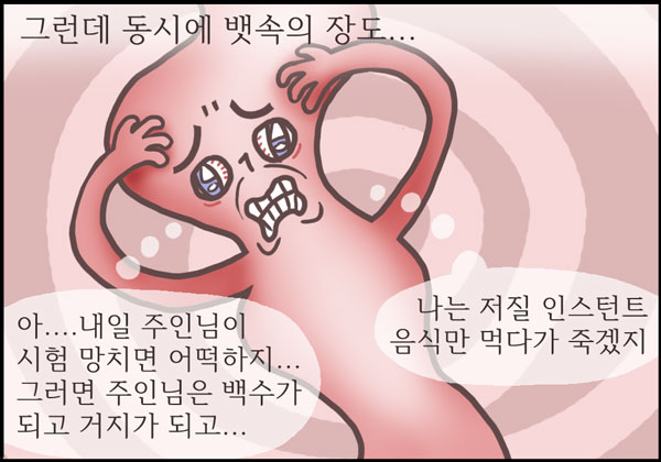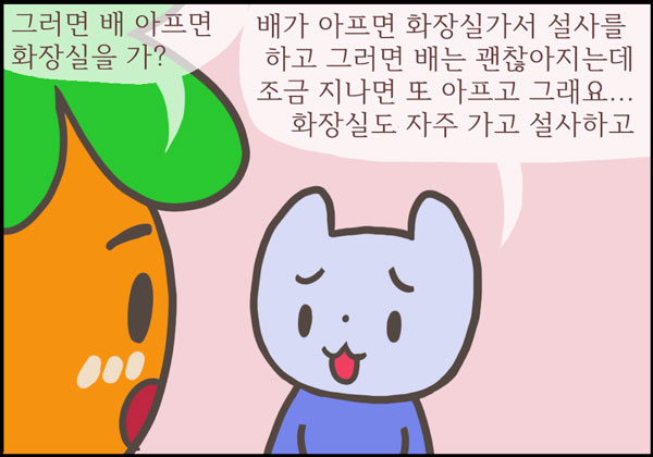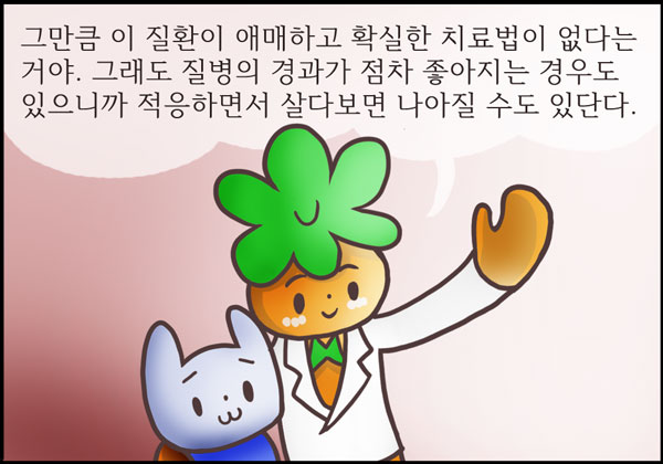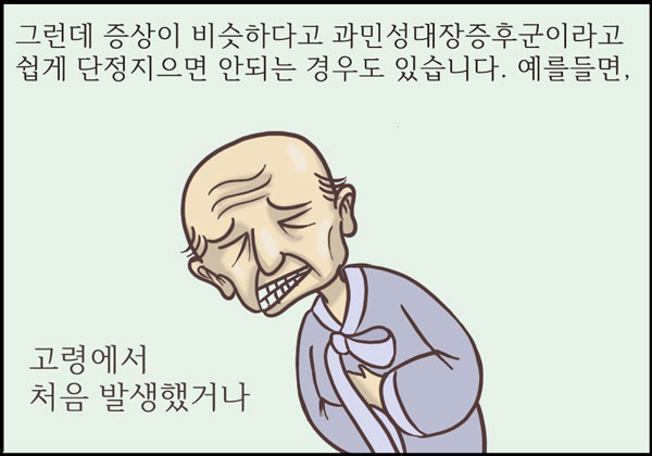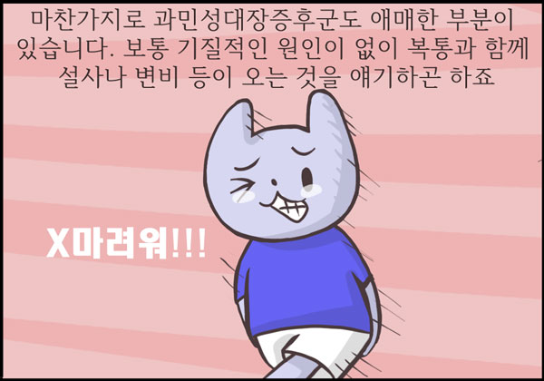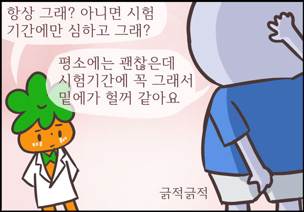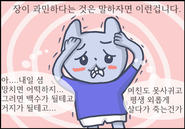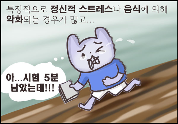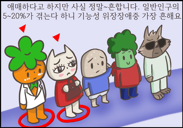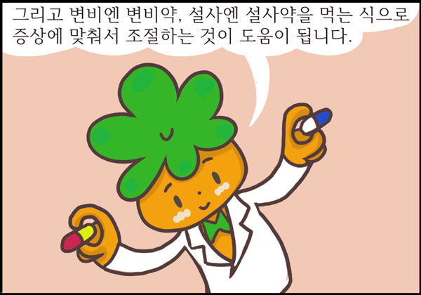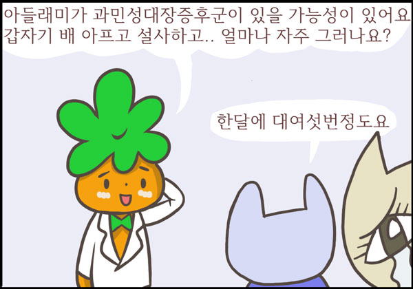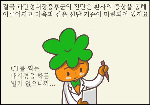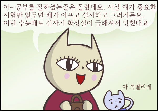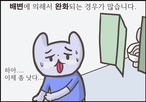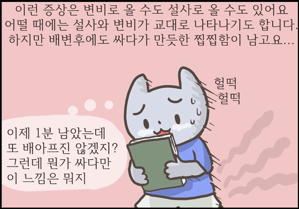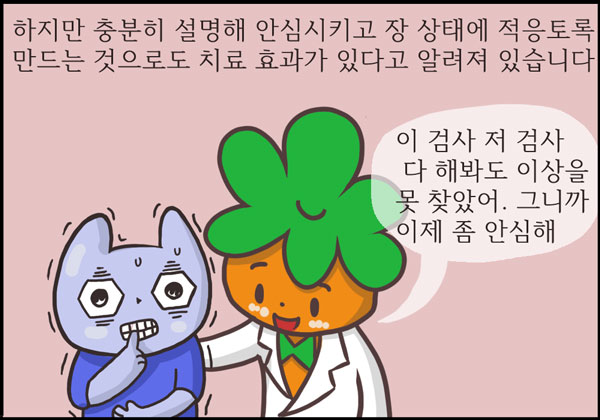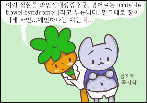 닥터단감 “시험만 앞두면 화장실을 들락거려요” 개인이 의미 있는 삶을 살기 위해서 개인의 이상을 실현하는 것도 중요하지만 그 또한 기본적인 의식주를 제대로 갖춘 후에나 가능하다. 그리고 의식주 중에 특히 먹는 것은 순간 순간 행복을 줄 수 있는 중요한 요소이다. 하지만 잘 먹는 것만큼 중요한 것이 잘 싸는 것이다. 과민성대장증후군 (Irritable Bowel Syndrome, IBS)은 그런 의미에서 환자들을 살금살금 괴롭히는 대표주자와 같다. 과민성대장증후군은 악성질병도 아니고 수술을 요하는 그런 중증의 질병으로 대접받지는 못하지만 유병률이 5~20%에 이를 정도로 매우 흔하며 개인의 정상적인 생활을 훼방하는 ‘겪어본 사람은 정말 미치게 만드는’ 그런 병이기도 하다. 대개 ‘정신적 스트레스나 음식 등에 의해 악화되는 설사나 변비와 함께 오는 복통’ 정도로 정리할 수 있는데 과민성대장증후군의 진단을 위해서 ‘ROME CRITERIA III’라는 진단 기준이 제시되어 있다. 물론 앞으로 이런 진단기준이 바뀔 가능성도 있지만 저런 증상을 자주 겪게 되어 정상적인 생활이 파괴된 사람을 과민성대장증후군 환자로 볼 수 있다. 과민성대장증후군의 원인은 모호하다. 장의 운동성의 이상, 장의 과민성, 장내 세균총의 이상, 중추신경-장의 신경전달체계의 이상, 환자의 신경정신학적 문제 등이 원인으로 지적되지만 어느 하나 확실한 설명이 되어주지는 못한다. 치료법 또한 마찬가지다. 환자를 안심시키는 것(Reassurance)만으로도 어느 정도 증상이 조절되기도 하지만 설사나 변비 등을 조절하기 위해서 약을 써야 될 수도 있고 유산균 복용도 연구가 많이 이루어지고 있지만 효과가 탁월하지 않고 항생제 요법도 연구되고 있지만 제한적인 효과와 부작용 등으로 선뜻 일반적인 치료법으로 사용하기는 어려운 구석이 있다. 최근에는 장의 운동과 관련된 세로토닌의 역할과 관련하여 항우울제로 사용되는 선택적 세로토닌 재흡수 억제제 (Selective Serotonin Reuptake Inhibitor, SSRI)에 대한 연구가 많이 이루어지고는 있지만 아직 결과를 더 지켜봐야 하는 상황이다. 이런 질병의 특징은 환자들이 확실한 치료효과에 대한 갈망으로 과학적 근거가 부족한 치료법에 빠질 수 있다는 점으로 이는 반드시 지양해야 한다. 다행인 것은 많은 환자들이 소화기내과 전문의의 도움을 통해 과민성대장증후군을 잘 조절할 수 있다는 것이다. 흔하고 완치가 어려운 만큼 연구도 많이 이루어지고 있는 분야이니 증상조절을 통해 정상적 생활을 할 수 있다면 점차 나아지는 경우도 많고 또 더 좋은 치료법이 개발될 수 있을 것으로 보인다. <1> 영문판 : http://doctordangam.com/?p=1081 <2> 네, 이번 에피소드에는 ‘카카오프렌즈’에 나오는 이모티콘을 패러디한 장면들이 있습니다.
