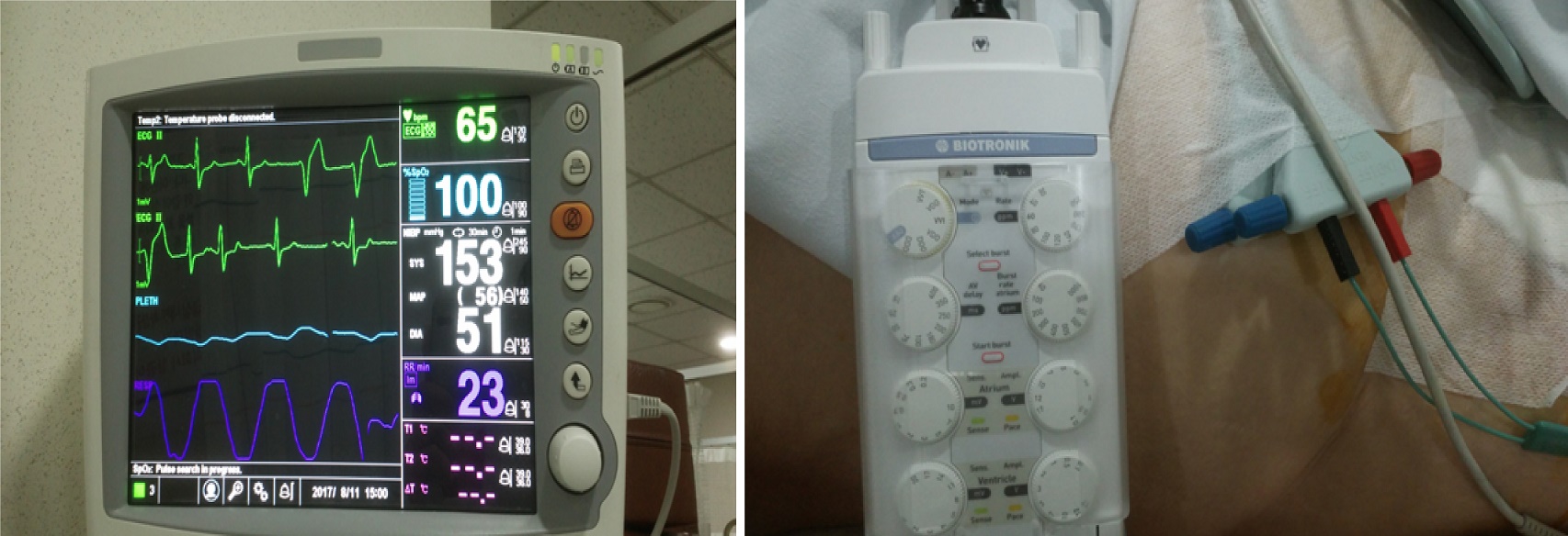 시술은 그리 오래 걸리지 않았습니다. 응급실로 돌아온 할머니의 심박동은 안정되어 있었고 혈압도 정상범위입니다. 할머니 표정도 한결 편안해졌네요. 옆구리에 붙은 기계가 다리 혈관을 타고 들어가 할머니의 심장이 규칙적으로 뛰도록 전기신호를 주고 있는 것이겠죠. 같은 병원 의사 선생님의 작품이지만 자주 시행하는 시술은 아닌 덕에 저로서는 신기할 따름입니다. 할머니께 양해를 구하고 시술을 마친 심박동 모니터와 기계 사진을 찍었습니다.