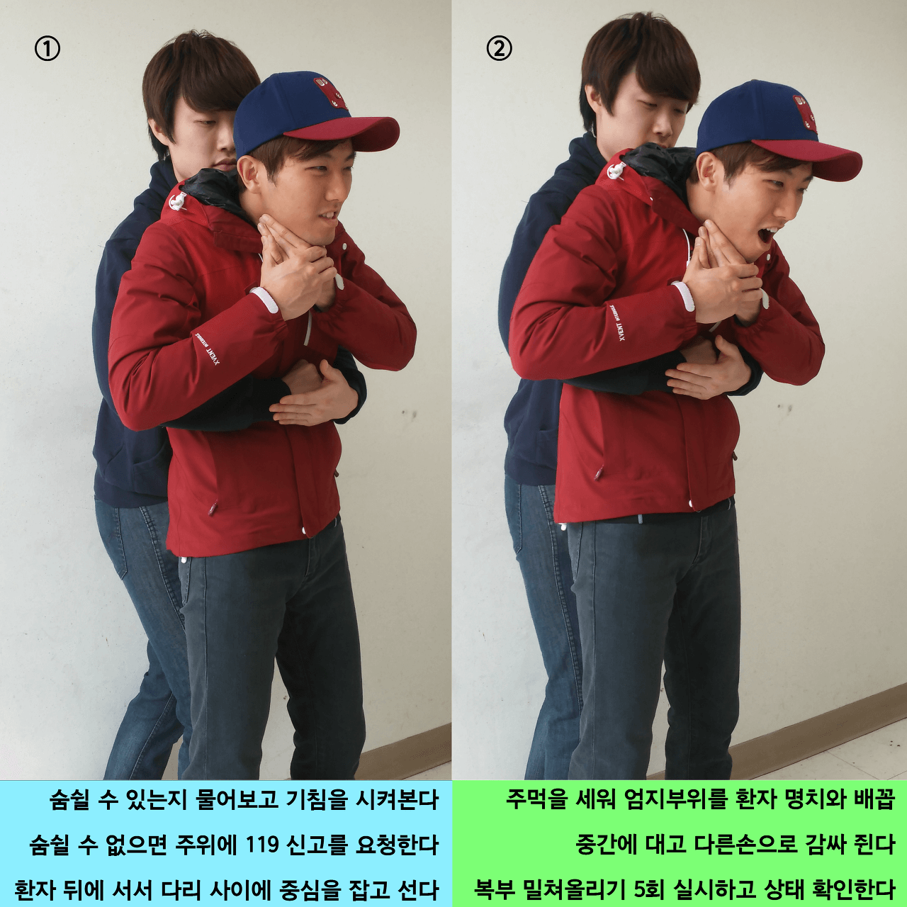 먼저 명절을 맞아 떡 등을 먹고 소아나 고령의 가족에게 기도폐색이 오는 경우가 있을 수 있습니다. 만약 떡을 먹고 갑자기 숨을 쉬지 못하겠다는 표현(초킹 사인, choking sign)을 보이는 경우 119 구급대에 연락을 하고 동시에 복부 밀쳐 올리기 법(하임리히 법)을 시도해볼 수 있습니다. 의식이 없어진 경우 심폐소생술을 시행해야 합니다.