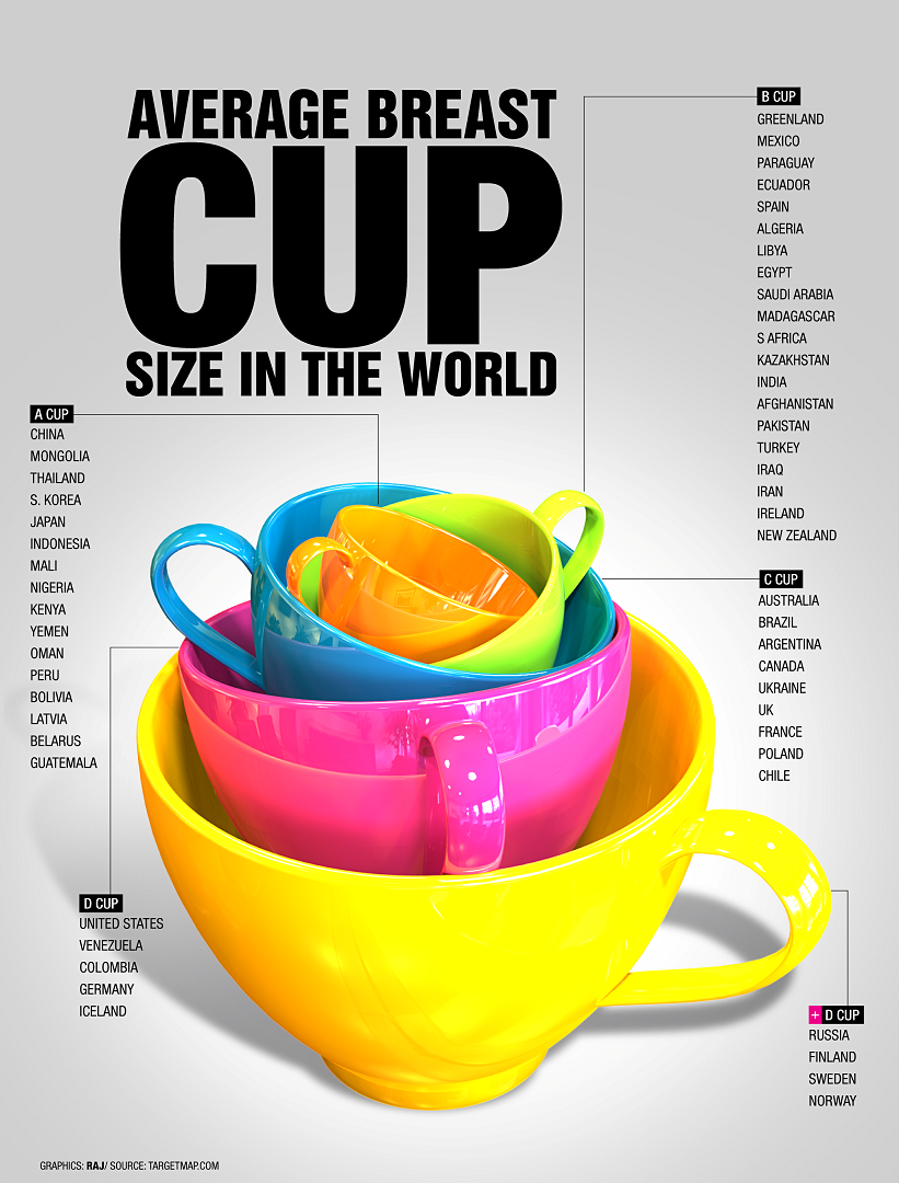통계청 자료 및 여러 다른 기관의 자료를 종합해보면 한국인의 평균 가슴 크기는 75A입니다. 즉, 평균적으로는 A컵의 크기이지요. 실제로 D컵인 여성들이 많지 않다는 점을 고려해보면, 가슴의 크기가 클수록 유방암이 많이 생긴다는 이야기는, 한국에서는 꼭 맞는 이야기는 아닌 셈입니다. 그럼, 세계 여성들의 가슴 크기는 어떨까요? infographic에서 보시면 알겠지만, 미국의 경우 D컵이고, 러시아나 스웨덴의 경우는 D+컵입니다. 이런 나라에서 유방암이 많이 생기는 것을 보면, 위에서 언급한 연구 결과가 맞는 것 같기도 합니다.