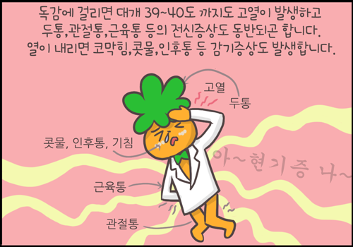 독감에 걸리면 39도에서 40도까지 오르는 고열이 발생하고 두통, 관절통, 근육통 등의 전신 증상도 동반되곤 합니다. 열이 내리면 코막힘, 콧물, 인후통 등 감기 증상도 발생합니다.