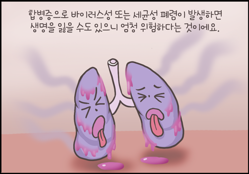 물론 이런 심각한 상황은 걸린다고 무조건 그런 것은 아니고 합병증으로 바이러스성 또는 세균성 폐렴 같은 질환이 발생했을 때 얘기입니다.