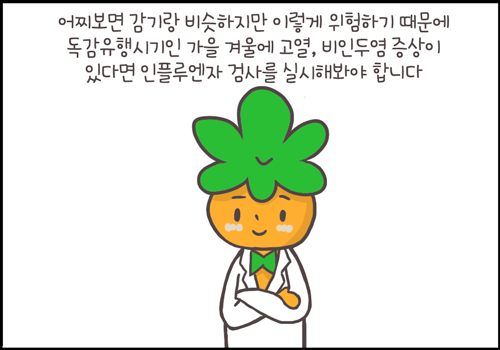 하지만 증상의 정도에 따라 감기와 비슷해 보일 수 있기 때문에 독감 유행시기인 가을 겨울에는 고열, 비인두염 증상이 있다면 인플루엔자 검사를 실시해봐야 합니다.