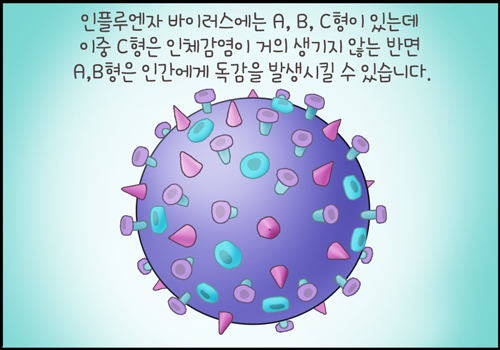 인플루엔자 바이러스에는 A, B, C형이 있는데 이 중 C형은 인체 감염이 거의 생기지 않는 반면 A, B형은 인간에게도 독감을 발생시킬 수 있습니다.
