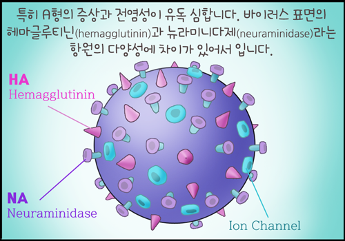 특히 A형이 증상과 전염성이 유독 심한데, 바이러스 표면에 있는 헤마글루티닌 (hemagglutinin)과 뉴라미니다제 (neuraminidase) 라는 항원의 다양성에 차이가 있어서입니다.