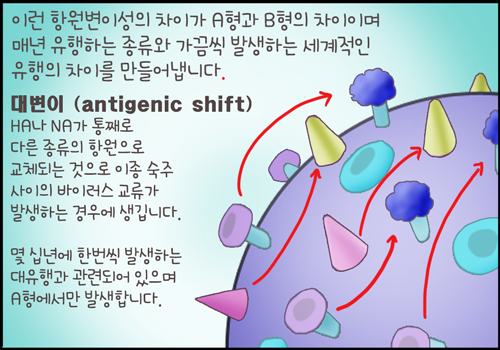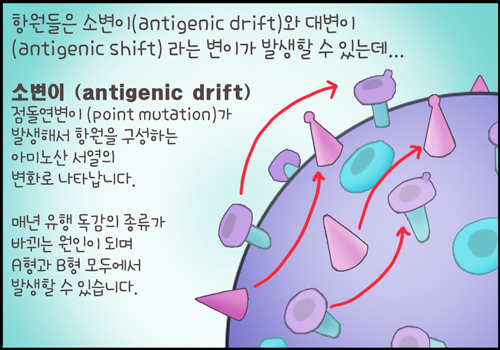 소변이(antigenic drift)는 점돌연변이에 의해서 항원을 구성하는 아미노산 서열의 변화로 나타나는데 매년 유행하는 독감이 바뀌는 원인이며 A형과 B형 모두에서 발생할 수 있죠.