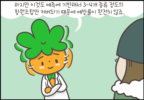 매년 독감 백신을 맞아야 하는 것은 매년 유행하는 독감이 다르기 때문이고 우리가 맞는 독감 백신은 예측에 기반해서 3~4개 정도의 항원조합에 방어할 수 있는 백신을 맞기 때문입니다. 예방률이 그만큼 완벽하지도 않습니다.