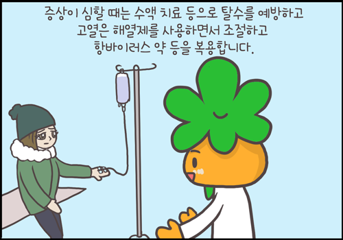 독감 치료는 기본적으로 대증치료이긴 합니다. 입원치료가 꼭 필요한 것은 아닙니다. 탈수가 생기지 않도록 물도 많이 마시고 필요한 경우 수액치료를 받아야 할 수도 있고 고열 등에 대해서는 해열제 같은 증상완화치료가 필요합니다. 또 항바이러스제 복용을 통해서 경과를 단축시킬 수 있습니다.