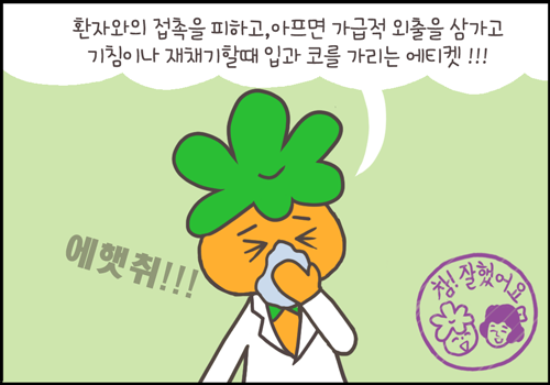 환자와의 접촉을 피하고 아프면 가급적 외출을 삼가고 기침이나 재채기할때는 입과 코를 가리는 에티켓도 갖추는 것이 중요합니다. 마스크 쓰는 것도 도움이 될 수 있습니다.