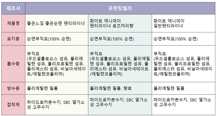 문제는 전 성분을 공개한다고 해도 과연 소비자가 위험성과 안전성을 해석하여 생리대 선택에 도움을 받을 수 있는가이다. 우리나라 생리대 시장의 경우 2016년 자료에 따르면 유한 킴벌리(50%), LG 유니참(21%), 깨끗한 나라(9%), 한국 P&G(8%)로 이 4개의 업체가 90%에 육박하는 시장 점유율을 보였다. 그 중 유한 킴벌리와 깨끗한 나라에서 생리대의 전 성분을 공개하였는데, 유한 킴벌리 제품의 원료를 살펴보자.