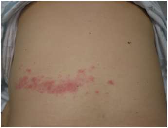 옷을 벗으며 보여준 학생의 어깨와 위팔에는 발진과 몇 개씩 모여있는 물집이 있었습니다. 오른쪽 경추 5번, 6번 신경분절을 따라서 생긴 전형적인 피부병변, 5일 전부터 좀 쑤시기만 하다가 통증이 심해지면서 어제 발진을 발견했다고 말하는 것으로 보아 전형적인 대상포진이었습니다.