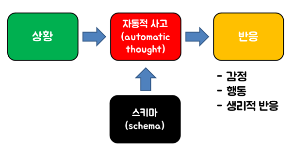 위의 도식을 참고하도록 하자. 상황을 해석하는 자신의 생각을 자동적 사고 (automatic thought)라 한다. 상황을 해석하는 자동적 사고에 따라서 감정적, 행동적, 신체적 반응이 달라지게 되는 것이다. 그런데, 이 자동적 사고라는 것이 사람에 따라 천차만별이다. 시험을 앞둔 상황에서 ‘ 나는 망했어. 이제 내 인생은 끝이야. 나는 영원히 일어설 수 없겠지.’ 와 같은 왜곡된 생각으로 상황을 받아들인다면, 체내의 교감신경은 꺼지지 않고 내내 활성화되어 시험 준비를 더욱 어렵게 만들 것이 분명하다. 이러한 상황에 대한 왜곡된 관점을 ‘생각의 오류’라 칭한다.