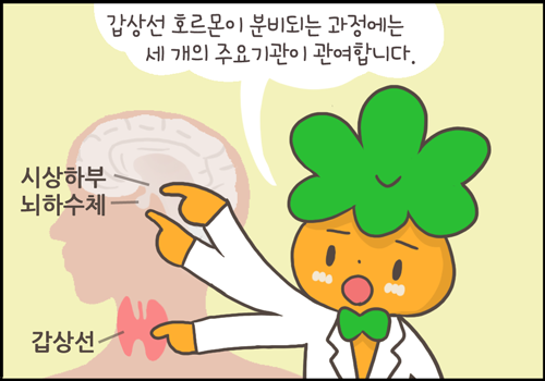 갑상선호르몬이 갑상선에서 분비되기까지 관여하는 세 개의 주요기관이 있습니다. 시상하부, 뇌하수체, 갑상선입니다.