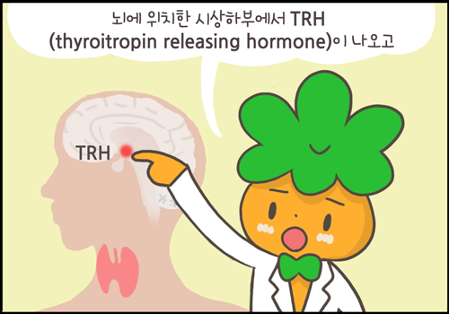 뇌에 위치한 시상하부에서 TRH(thyrotropin releasing hormone)가 나오고