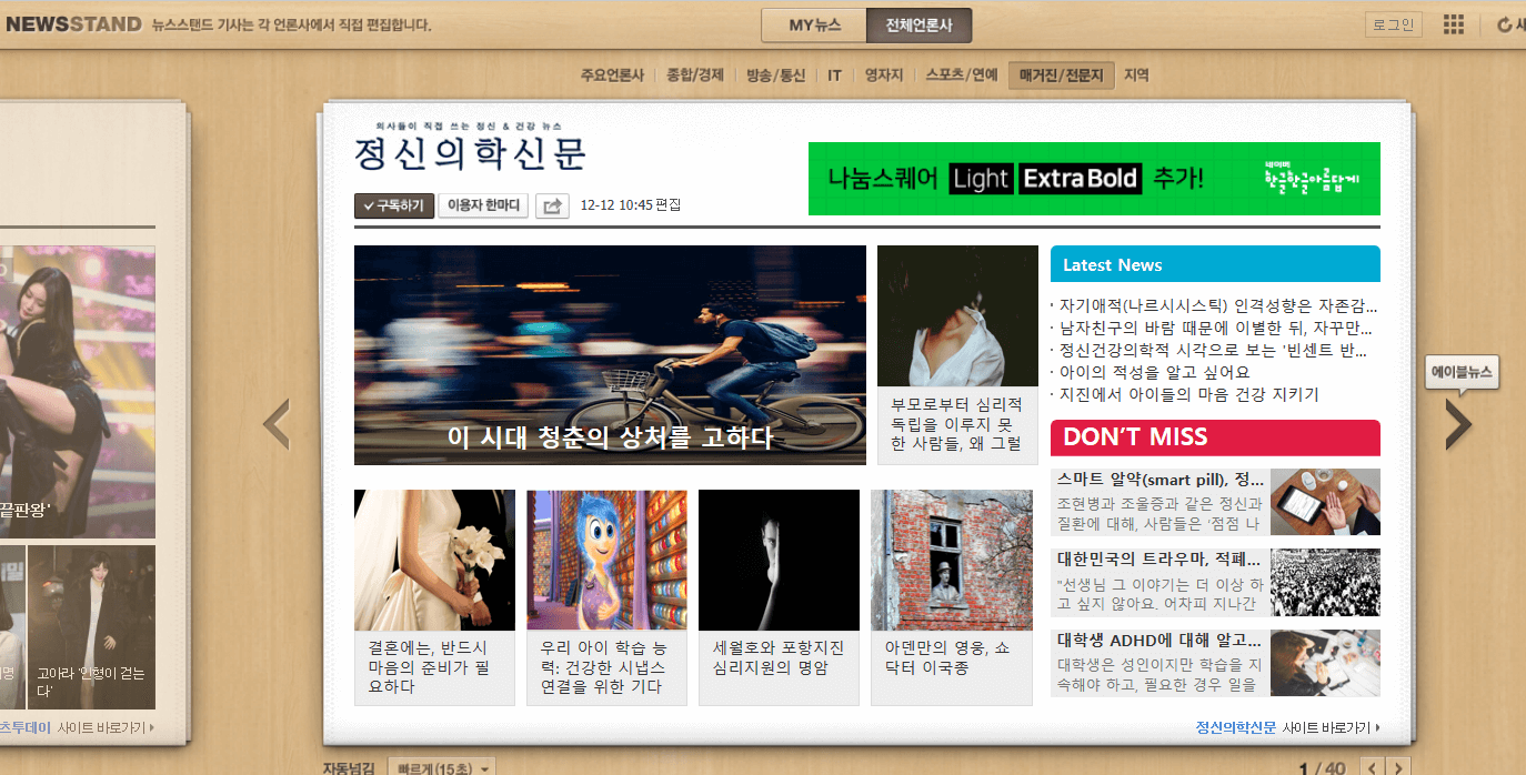 국내 유일의 정신건강 전문지 '정신의학신문'이 네이버 '뉴스스탠드' 서비스를 시작했다. 네이버 뉴스스탠드의 매거진/전문지 분야에 새로 입점 된 정신의학신문은 이제 독자들에게 한발 더 가까이 빠르게 다가갈 수 있게 되었다.