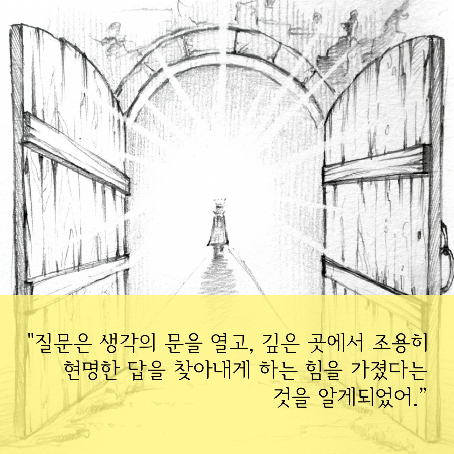 질문은 생각의 문을 열어 깊은 곳에서 조용히 현명한 답을 찾아내게 하는 힘을 가졌다는 것을 알게 되었어.”