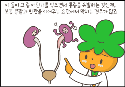 이 돌이 그 중 어딘가를 막으면 통증이 유발되는 것인데 보통 콩팥과 방광을 이어주는 요관에서 막히는 경우가 많아요.