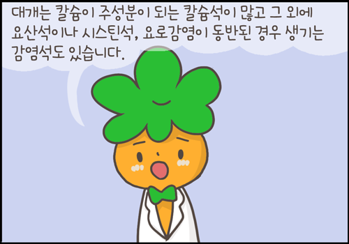 대개는 칼슘이 주성분인 칼슘석이 많고 그 외에 요산석이나 시스틴석, 요로감염이 동반된 경우 생기는 감염석도 있습니다.