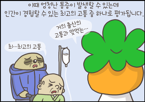 이때 느끼는 통증은 인간이 경험할 수 있는 최고의 고통 중 하나로 평가됩니다. 거의 출산의 고통 만큼 괴롭다고 합니다.