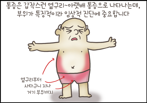 통증이 느껴지는 위치는 옆구리에서 아랫배를 거쳐 사타구니부터 음낭까지 생길 수 있습니다. 막힌 부위에 따라서 조금씩 다릅니다.