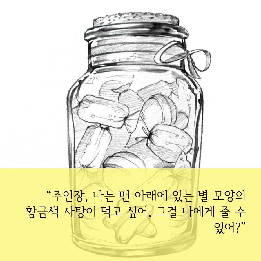 “주인장, 나는 맨 아래에 있는 별 모양의 황금색 사탕이 먹고 싶어, 그걸 나에게 줄 수 있어?”