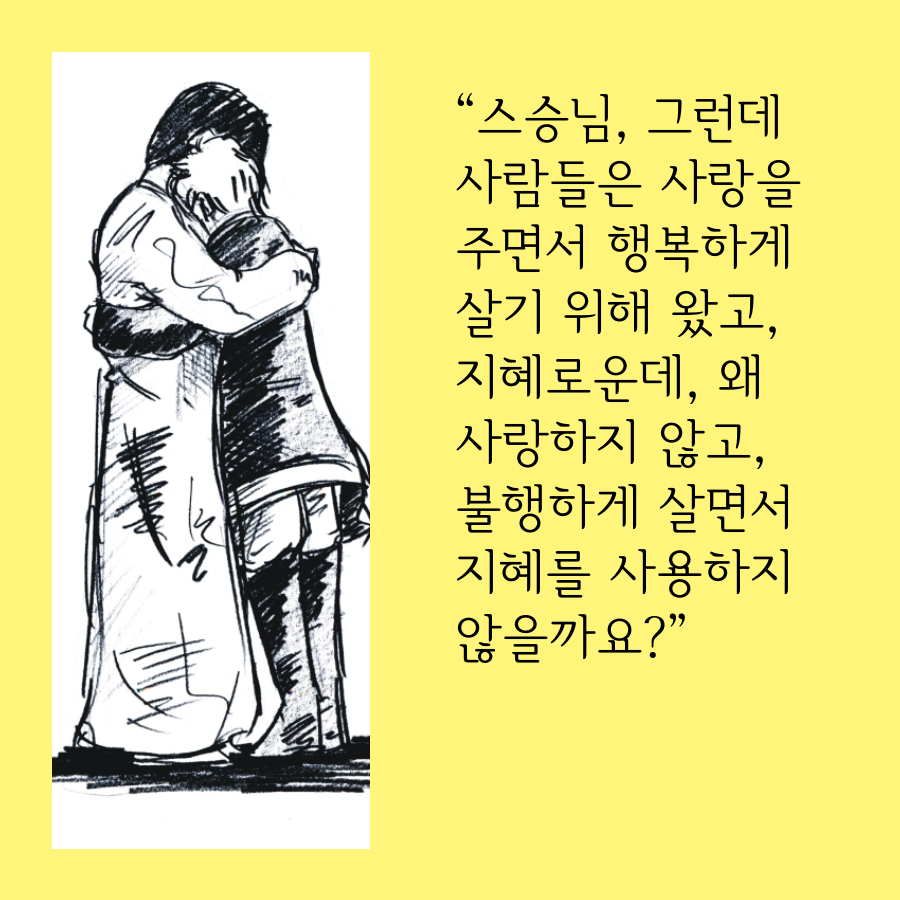 “스승님, 그런데 사람들은 사랑을 주면서 행복하게 살기 위해 왔고, 지혜로운데, 왜 사랑하지 않고, 불행하게 살면서 지혜를 사용하지 않을까요?”