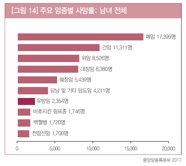 전제적으로 보면 2012년까지 수술을 마친 환자의 경우 5년 생존율이 91.2%이며 10년 생존율은 84.8%입니다. 성적이 좋은 편입니다. 다른 암들과 비교해봐도 사망률이 낮음을 알 수 있습니다. 가장 많은 사망환자가 발생하는 암은 폐암입니다. 그리고 간암, 위암, 대장암 순이지요. 여자 환자가 주로 걸린다는 특성을 고려해봐도 유방암 환자의 사망률은 낮은 편입니다.