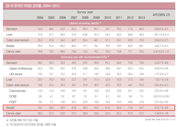 그렇지만 안심하기는 조금 이릅니다. 유방암 자체의 사망 추이가 점점 증가하고 있기 때문입니다. 아래 표를 보면 이해가 쉽습니다.