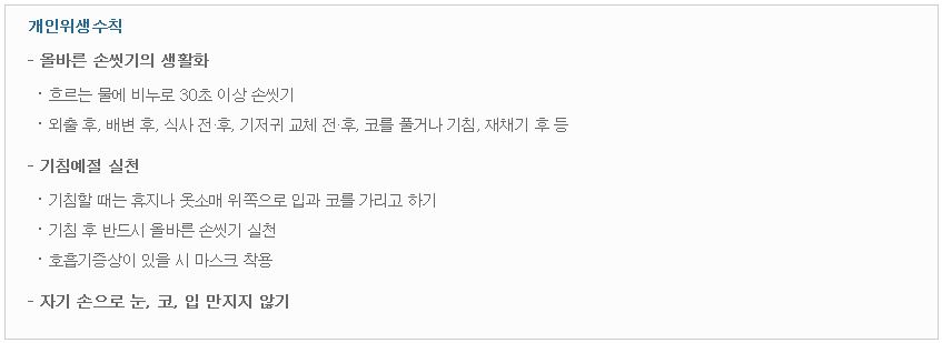 인플루엔자에 감염되었을 경우 집단 내 전파를 예방하기 위해 증상발생일로부터 5일이 경과하고 해열제 없이 체온 회복 후 48시간까지 어린이집, 유치원, 학원 등에 등원ㆍ등교를 하지 않도록 특히 주의해야 한다.