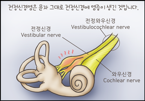 내이(inner ear)를 구성하는 전정기관(vestibule)과 달팽이관(와우, cochlea)은 각각 전정신경(vestibular nerve)과 와우신경(cochlear nerve)을 통해 중추신경계로 연결됩니다. 이중 전정신경에 염증이 생긴다는 것이죠.