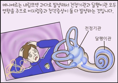 메니에르는 내림프액 과다로 발생해서 전정기관과 달팽이관 모두 영향을 줘서 어지럼증뿐만 아니라 청각증상이 함께 발생합니다.