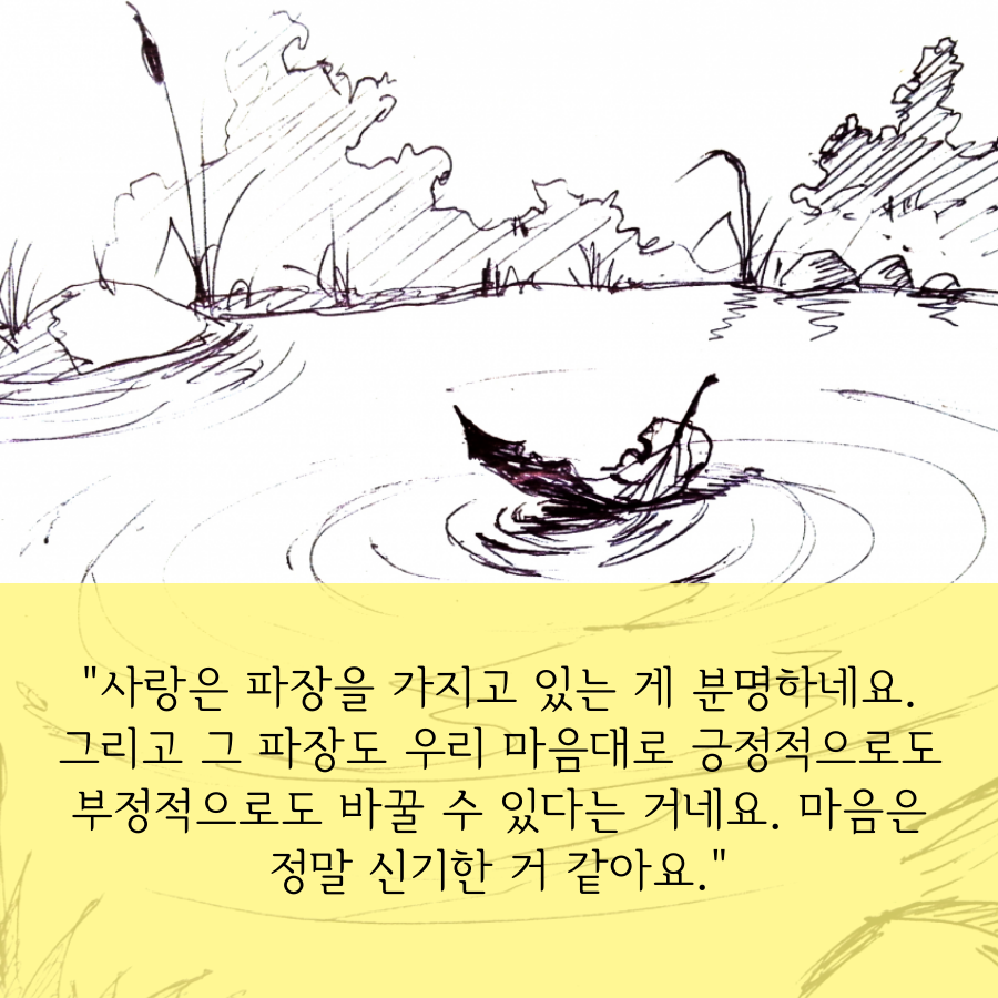"하지만, 그걸 못 느끼거나, 오히려 사랑이 생기는 것이 아니라, 질투가 생기는 사람도 있는 걸 보면, 사랑에 파장이 있는 것이 아니라, 받는 사람이 느끼는 것에 따라 달라지는 게 아닐까?"