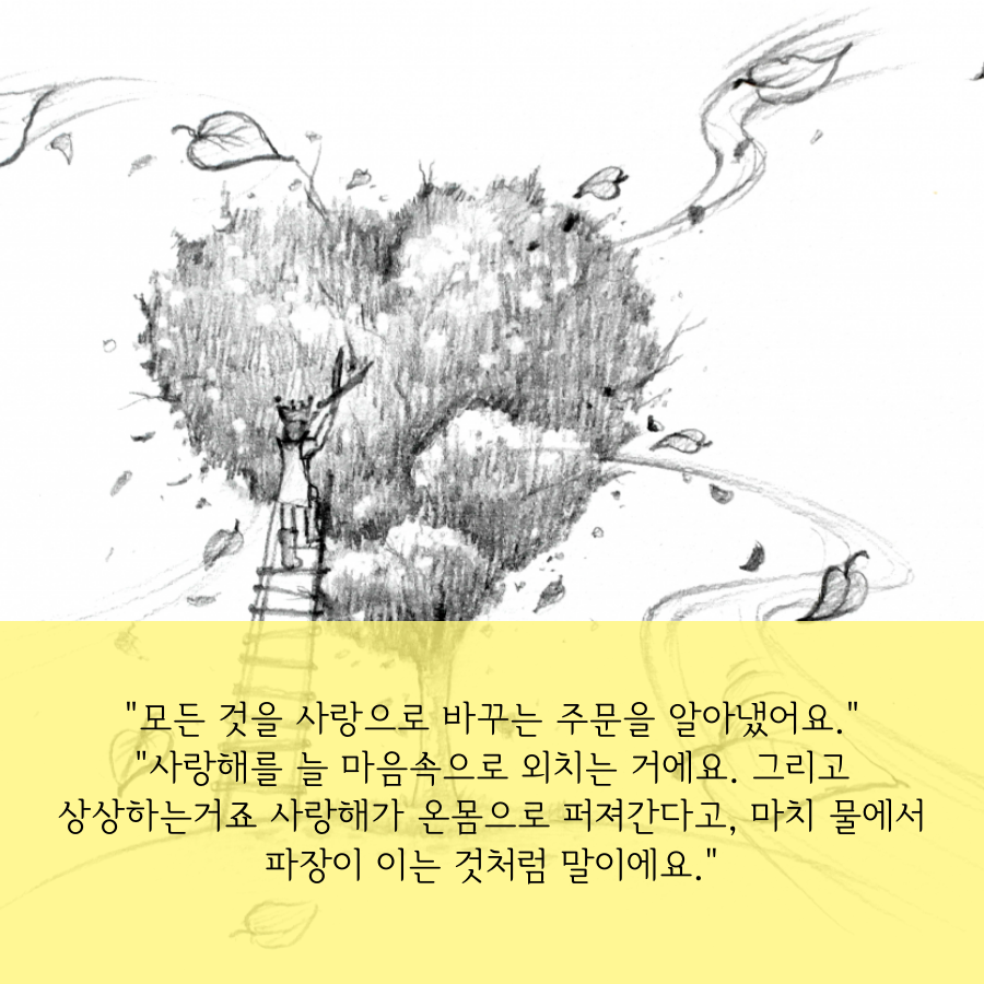 "'사랑해'를 늘 마음속으로 외치는 거에요. 그리고 상상하는 거죠. '사랑해'가 온몸으로 퍼져간다고, 마치 물에서 파장이 이는 것처럼 말이에요."