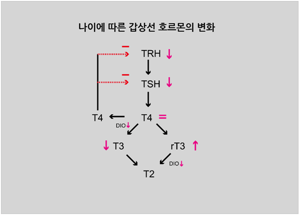 우선 갑상선 호르몬의 분비를 살펴보겠습니다. 그림에서 보는 것처럼 갑상선 호르몬은 점점 떨어지게 됩니다. 조금 어렵지만 시상하부에서 TRH(TSH releasing hormone)가 분비되고 이 TRH는 뇌하수체를 자극하여 TSH(Thyroid stimulating horome)를 분비하게 됩니다. 이 TSH는 갑상선을 자극하여 T3, T4를 분비하게 만들지요. 그런데, 노령기에 접어들게 되면 TRH 자체가 줄어들게 됩니다. 그에 따라 TSH도 줄어들게 됩니다. 그렇게 되면 당연히 T3와 T4도 줄어들게 될 것 같은데, 사실 T4는 별 변화가 없습니다. 왜냐하면 T4를 분해하여 몸에 더 효과적인 T3를 만들게 되는데, 이 분해 작용도 잘 이루어지지 않기 때문입니다. 그런데 T3 역시 줄어들게 됩니다. 아이러니 한 것은 rT3(reverse T3)라고 하는 호르몬을 분해하는 효소가 줄어들기 때문에 rT3는 몸속에 증가하게 됩니다. rT3는몸에서 갑상선 호르몬으로서의 역할을 하지 못하는 호르몬입니다.