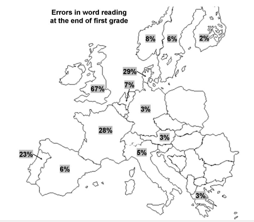위의 유럽지도에 표시된 수치는 초등학교 1학년 말에 혼자서 교과서를 읽는데 어려움을 보이는 학생의 비율을 수치로 나타낸 것이다. 영국이 압도적인 수치인 67%로 1위를 차지한다. 이어서는 덴마크가 29%, 그리고 프랑스가 28%로 뒤를 잇는다. 비교적 쉽다는 독일어와 스페인어의 경우에는 각각 3%와 6%로 못 읽는 학생의 비율이 낮다. 왜 문자마다 배우기 쉽고 어려움의 차이가 있을까? 여러 요인이 있지만 그중 가장 큰 요인은 그것은 문자와 발음의 대응, 좀 더 정확하게 말해서 낱자와 소리의 대응(letter-sound correspondence)이 얼마나 규칙적이냐에 달려 있다.