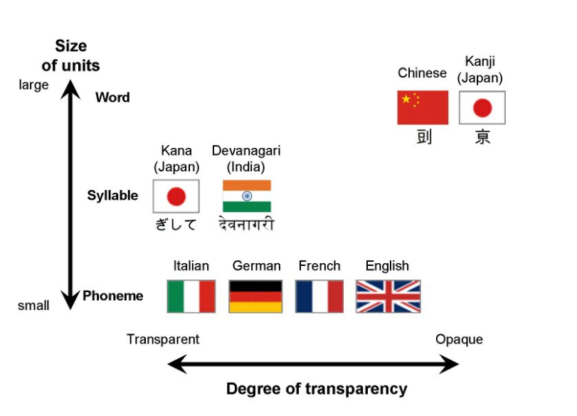 위 그림에서 세로축은 문자 체계의 종류를 나타낸다. 한문은 문자 하나가 단어 하나와 대응되는 것에 반해 일본어의 히라가나는 문자 하나와 음절 하나가 대응된다. 유감스럽게도 한글은 이 그림에서 표시되지 않았다. 계산을 잘 하는 사람이 계산해보니 이탈리어 정도에 해당한다고 한다. 한글이 세계에서 가장 낱자와 소리의 관계가 규칙적인 것은 아니다. 터키어나 스와힐리어가 더 규칙적이라고 되어 있다.