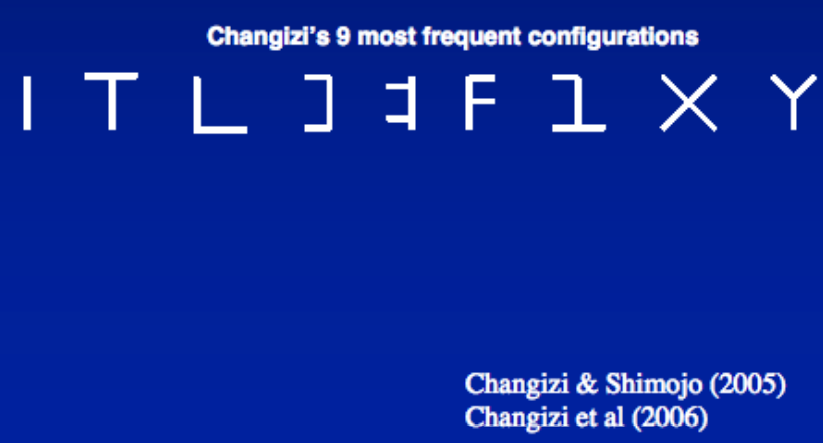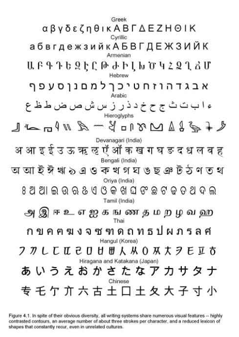 왜 이런 일이 생길까? 이 현상을 설명하기 위해 인지과학자 마크 챙기지는 세계의 문자들을 모두 분석한 후 문자들이 9개의 공통적인 모양을 공유하고 있다는 사실을 지적한다. 가장 흔한 것은 'ㅣ', 그 다음이 'ㅜ', 'ㄴ' 순서이다. 그러고 보니 한글도 그가 말한 공통적인 모양을 대부분 가지고 있다. 그리고 우리가 사물이나 얼굴을 인지할 때도 선과 선이 만나서 이루는 접합의 형태를 분석해서 알아내고 있다는 사실을 첨가한다. 5300년 전 메소포타미아에서 세금을 걷기 위해 쇄기 문자를 만들어낸 사람들은 처음에는 밀의 그림을 모양 그대로 그리다가 점차 인간이 얼굴을 알아볼 때 사용하는 뇌가 쉽게 알아볼 수 있도록 단순한 선과 선의 만남으로 단순화시켜왔다. 똑같은 일이 중국에서도, 남미에서도 발생했으며 이제 서로 교류하며 각자의 문자를 비교해보니 공통점이 많더라는 것이다. 외계인이 지구인들이 말하는 것을 보면 거의 같은 언어를 사용한다고 생각할 거라는 언어학자 노암 촘스키의 주장과 일맥상통한다.