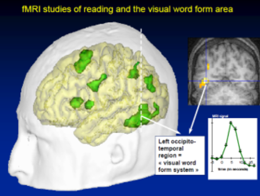 세계 사람들이 공통으로 사용하는 이 영역은 좌측 후두엽과 측두엽이 만나는 곳에 있는데 방추체 모양으로 생겼다. 난독증을 가진 아이들의 뇌를 조사해서 건강한 아이들의 뇌와 비교해보면 바로 이 방추체 영역의 활성이 떨어져 있었다. 글을 잘 읽는 아이들은 잘 읽는 만큼 활성도가 높았기 때문에 이 영역을 문자를 읽는 기능만 전담하는 ‘읽기 센터’라 할 수 있다.