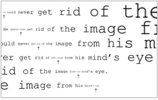 황반주변 확대법(parafoveal magnification technique)이라는 기술인데 위 그림처럼 화살표로 표시된 부분의 좌우측 이미지를 확대해서 제시해 주는 것이다. 실험에 참여한 대학생들은 의외로 생소한 글자도 잘 적응해서 읽어낼 수 있었다. 그러나 읽기속도를 늘리는 데는 실패했다. 문제는 한 번에 받아들이는 글자의 양이 아니라 우리 뇌가 그것을 처리하는 속도가 한번에 14글자를 넘어서지 못했다. 평범한 책 읽기 대신 여러 방법으로 한 번에 많은 글자를 주입하려는 시도는 모두 실패할 수밖에 없다는 결론이다.