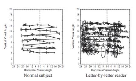아이트레커의 기록을 보면 우리의 눈은 물 흐르듯이 책을 읽어가는 것이 아니고 멈춰서 14글자 정도 파악 후 옆으로 점프한 다음 멈추는 모습을 보인다. 한 글자씩 읽어가는 아이는 눈이 멈추는 지점이 훨씬 많다. 초등학교 1학년은(미국 기준) 100단어 당 191번 멈추고, 6학년은 106번 멈춘다. 읽기 능력이 늘수록 한 번에 들어오는 글자가 많아 드문드문 점프하면서 읽는 모습을 볼 수 있다. 더 정교한 장비로 측정하면 우리의 눈이 직선으로 움직이는 것이 아니고 늘어난 스프링처럼 곡선운동을 한다고 한다. 왜 읽기가 아직 익숙하지 않는 아이들이 자주 거슬러 올라가서 읽는 것일까? 쓸데없이 시간만 잡아먹는 행동인지, 아니면 정확한 내용파악을 위해서 하는 수 없이 해야 하는 행동인지는 책을 읽어본 사람이라면 누구든 판단을 내릴 수 있을 것이다.