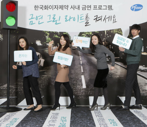 한국화이자제약은 28일 사옥 1층 로비에서 금연을 희망하는 직원과 해당 팀원들이 함께 금연 성공을 다짐하면서 기념사진을 찍는 포토이벤트로 금연프로그램의 시작을 알렸다.