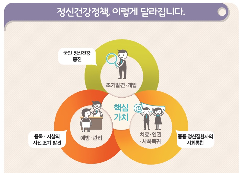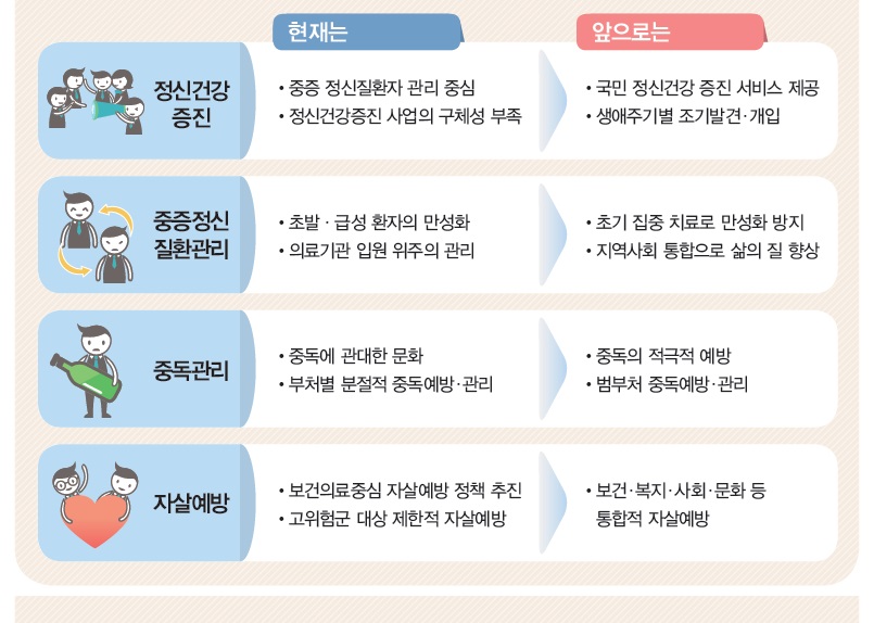 정신보건법상 복지부 장관은 5년마다 국가 정신보건 사업 계획을 수립하도록 규정되어 있으며, 이번 발표한 정책안은 지난 2012년 발표한 ‘정신건강증진 종합대책’ 이후에 4년 만에 수립된 것이다. 12년 당시에도 일반 국민에 대한 정신건강 증진과 정신질환의 조기발견 개입 등에 대한 기틀 마련을 위한 계획을 발표했으나 그간 종합대책에 대한 구체적인 실행계획이 부족하다는 평가를 받아왔다. 이에 이번에 보건복지부, 교육부, 고용부, 법제처 등이 함께 참여해 새로 발표한 종합 대책에서는 WHO 권고기준에 맞춰 2020년까지 실행될 5개년 계획을 마련하였으며 그 주된 골자는 다음과 같다.