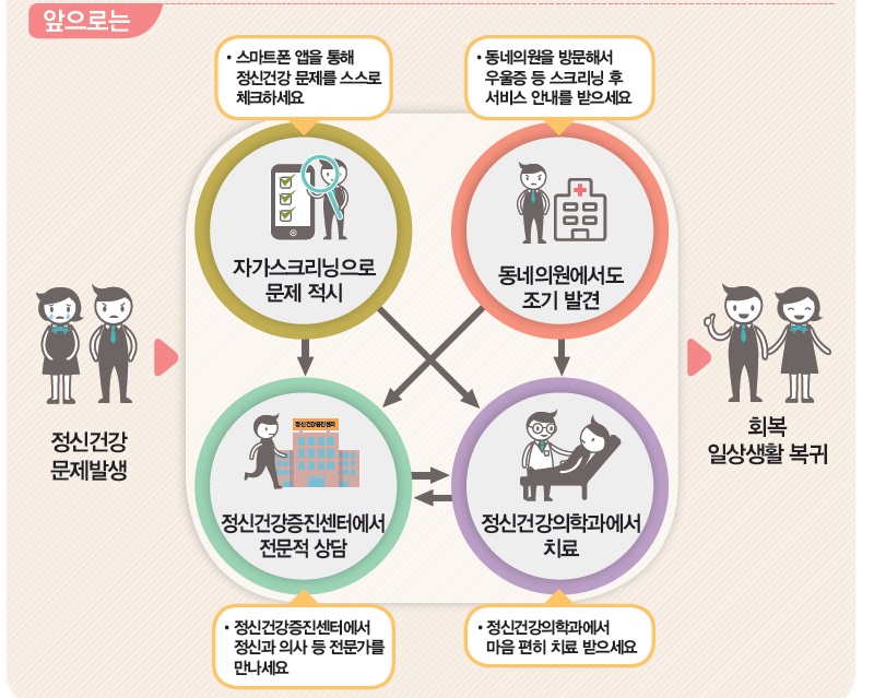 - 심리부검 결과 자살자의 28.1%가 자살 전 복통 등 신체적 불편감이나 수면 곤란 등으로 1차 의료기관을 방문했다는 사실에 밝혀졌다. 이에 근거하여 정부는 정신건강의학과가 아닌 일반 의원을 통해 의원 방문시 환자들의 우울, 불안 등의 주요 정신과적 문제를 탐색하여 필요시 지역정신건강 센터로 연계를 할 수 있도록 도모할 계획이다. 또 국가 건강보험공단 건강검진시에도 정신건강 검진을 도입하여 치료 전 환자들을 조기 발견하여 정신건강센터로 연계할 계획이다. 이렇게하여 연계된 지역사회 정신건강센터 내에는 ‘마음건강 주치의’라 칭한 정신과 전문의가 배치될 예정이다. 지역사회 보건센터에서 정신과 전문의와의 상담을 통해 조기 치료와 정신의료기관과의 적절한 연계를 실시하게 된다는 것이다.
