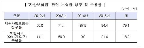 소비자원이 2012∼2015년 접수한 피해구제 신청 43건을 분석한 결과 ‘정신질환 자살’인 경우 고객의 재해사망보험금 지급 요구는 79.1%로 높았지만 보험사의 합의율은 18.2%로 매우 낮게 나타났다.